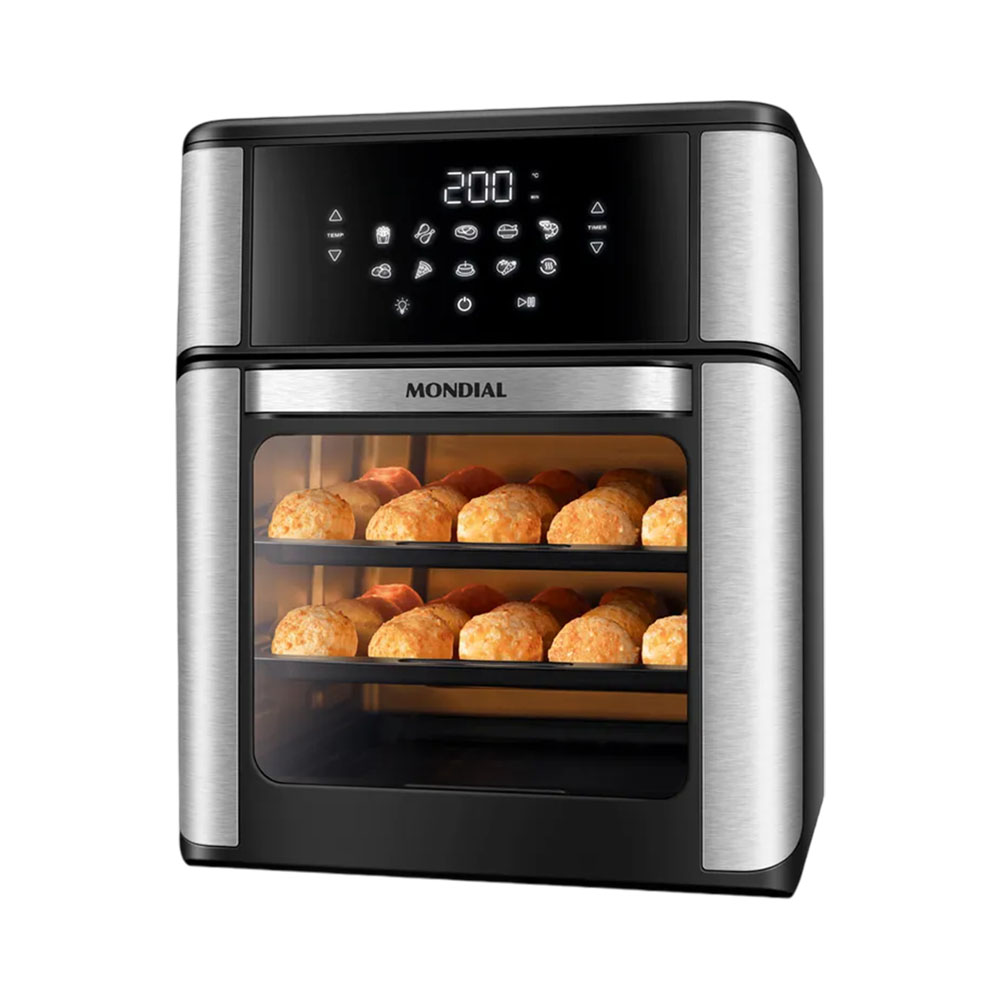 Air Fryer + Horno Mondial 12L Digital con potencia de 2200W. Incluye 3 bandejas antiadherentes, panel digital con 10 funciones predefinidas y cesta de 5L. Cocina rápida y saludable.