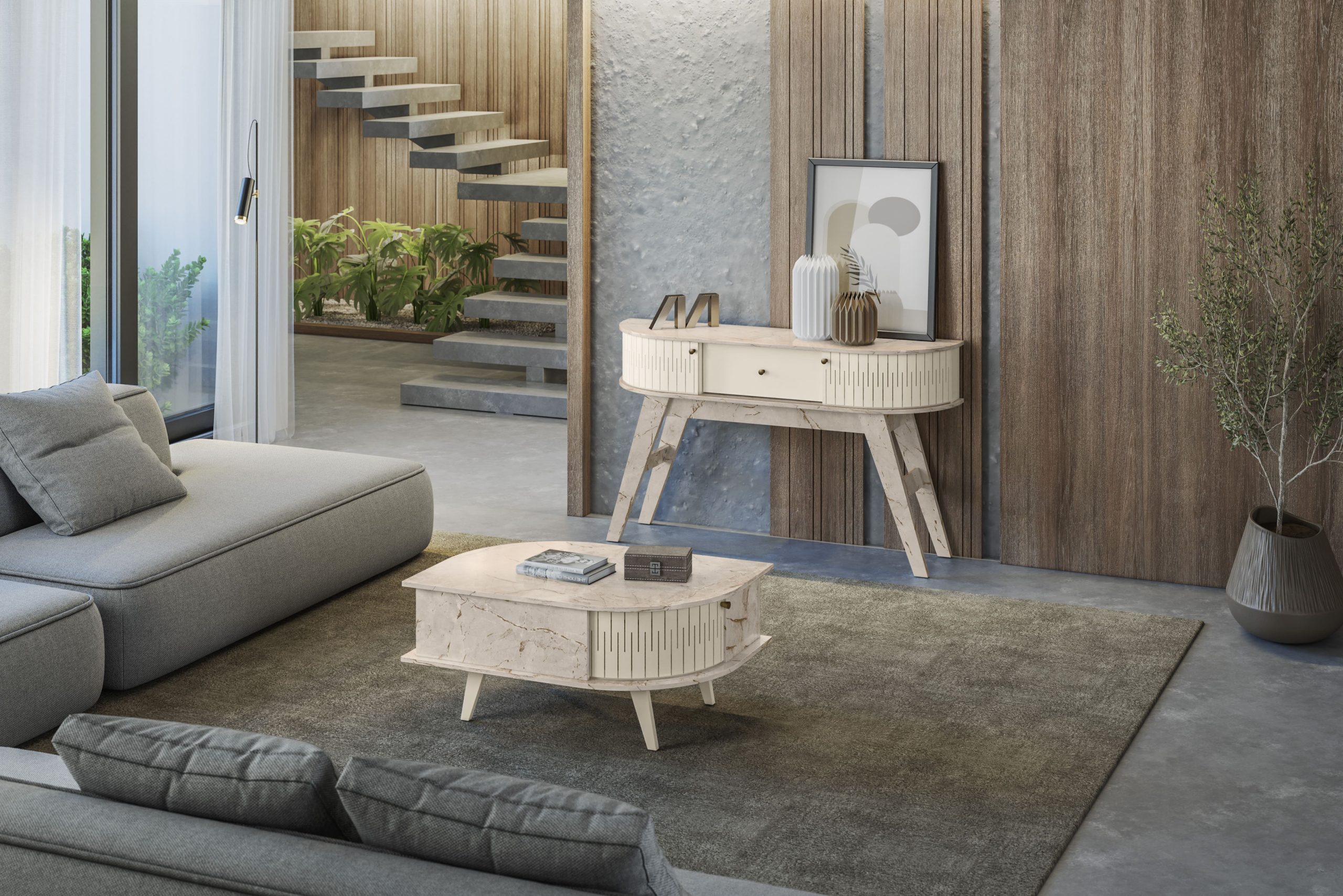 El Aparador R3 es un mueble con un diseño europeo único que combina líneas curvas con un estilo moderno y funcional. Cuenta con 2 puertas flexibles, un cajón con correderas telescópicas, y manijas en color bronce que le dan un toque sofisticado. Sus pies de poliestireno aportan estabilidad y un estilo contemporáneo.