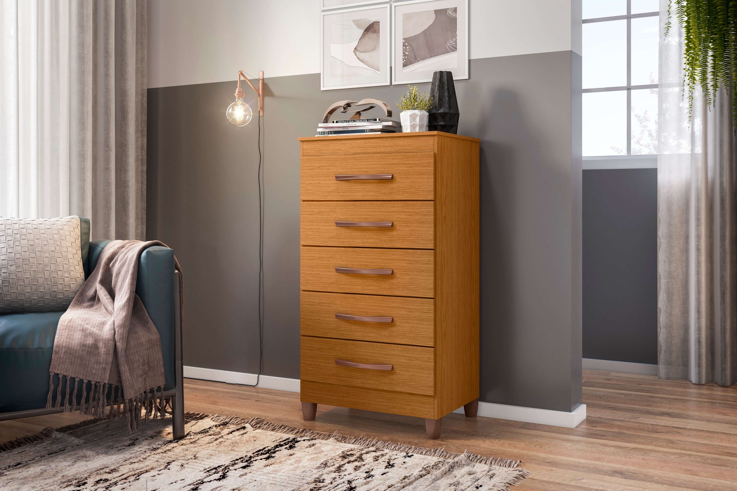 La Cómoda R5 es el mueble perfecto para organizar tu habitación. Con 5 cajones equipados con correderas metálicas y manijas con terminación metalizada, ofrece durabilidad y un diseño moderno.