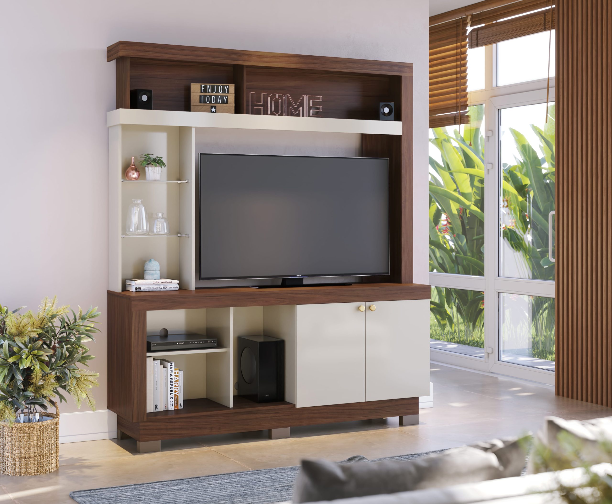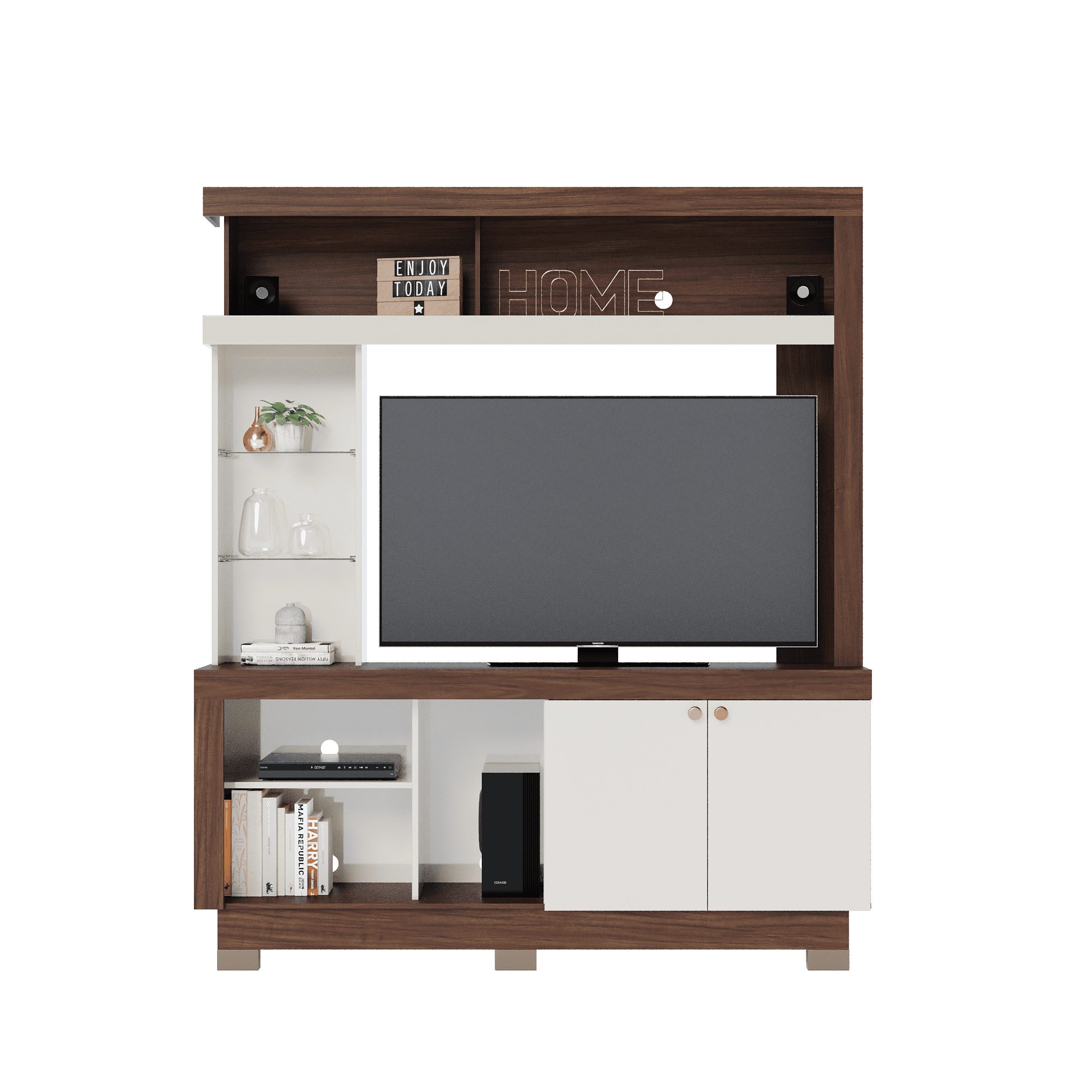 Este mueble cuenta con dos puertas, estantes laterales y nichos perfectos para objetos decorativos o electrónicos, lo que te permite mantener todo organizado y accesible.