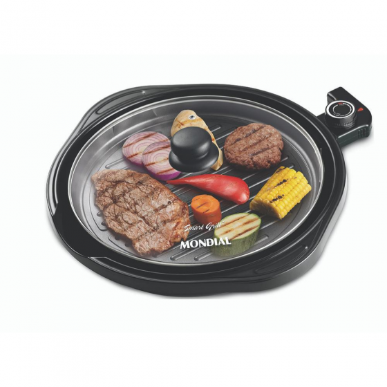 Grill Redondo Smart Grill Mondial con chapa antiadherente, control de temperatura y bandeja recolectora de grasa. Ideal para cocinar de forma práctica, rápida y saludable.
