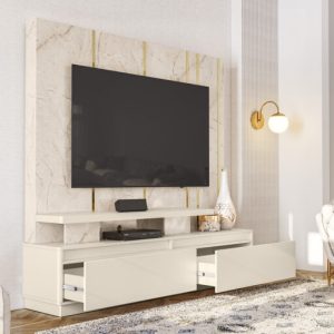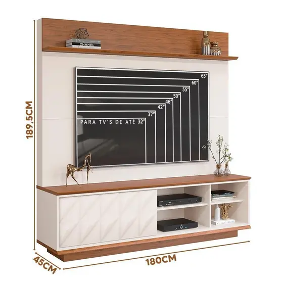Con dimensiones de 180 cm de largo, 190 cm de alto y 45 cm de profundidad, es un centro de entretenimiento ideal para quienes buscan organización y estética en su sala.