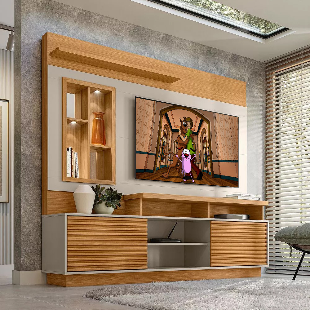 📌 Palabras clave: home TV, centro de entretenimiento moderno, mueble con luz LED, puertas ripadas.