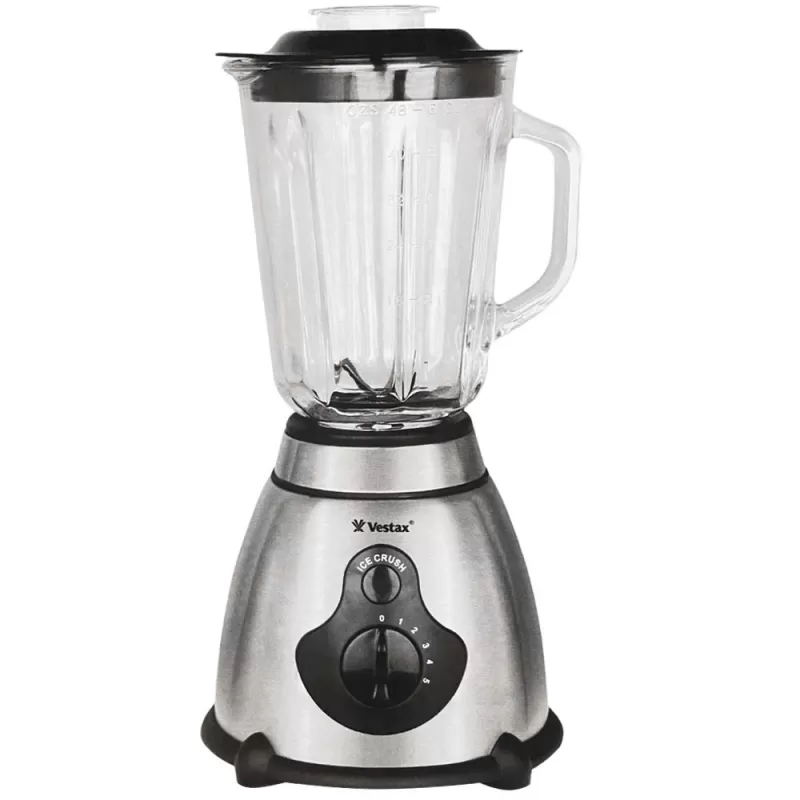 Licuadora Vestax VT-911 con jarra de vidrio de 1.5L, 5 velocidades, cuchilla de acero inoxidable y 500W de potencia. Ideal para preparar salsas, tragos y más.