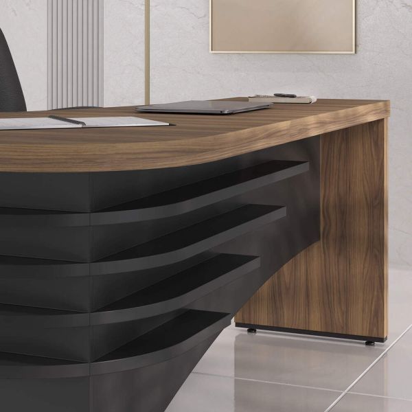 La estética lo es todo en los negocios. El acabado en Nogal y Negro ofrece un contraste moderno y sofisticado que combina con cualquier silla gerencial de cuero. Los detalles curvos en el exterior del escritorio suavizan las líneas, aportando un toque de diseño contemporáneo que impresionará a tus clientes y socios desde el momento en que entren a tu despacho.