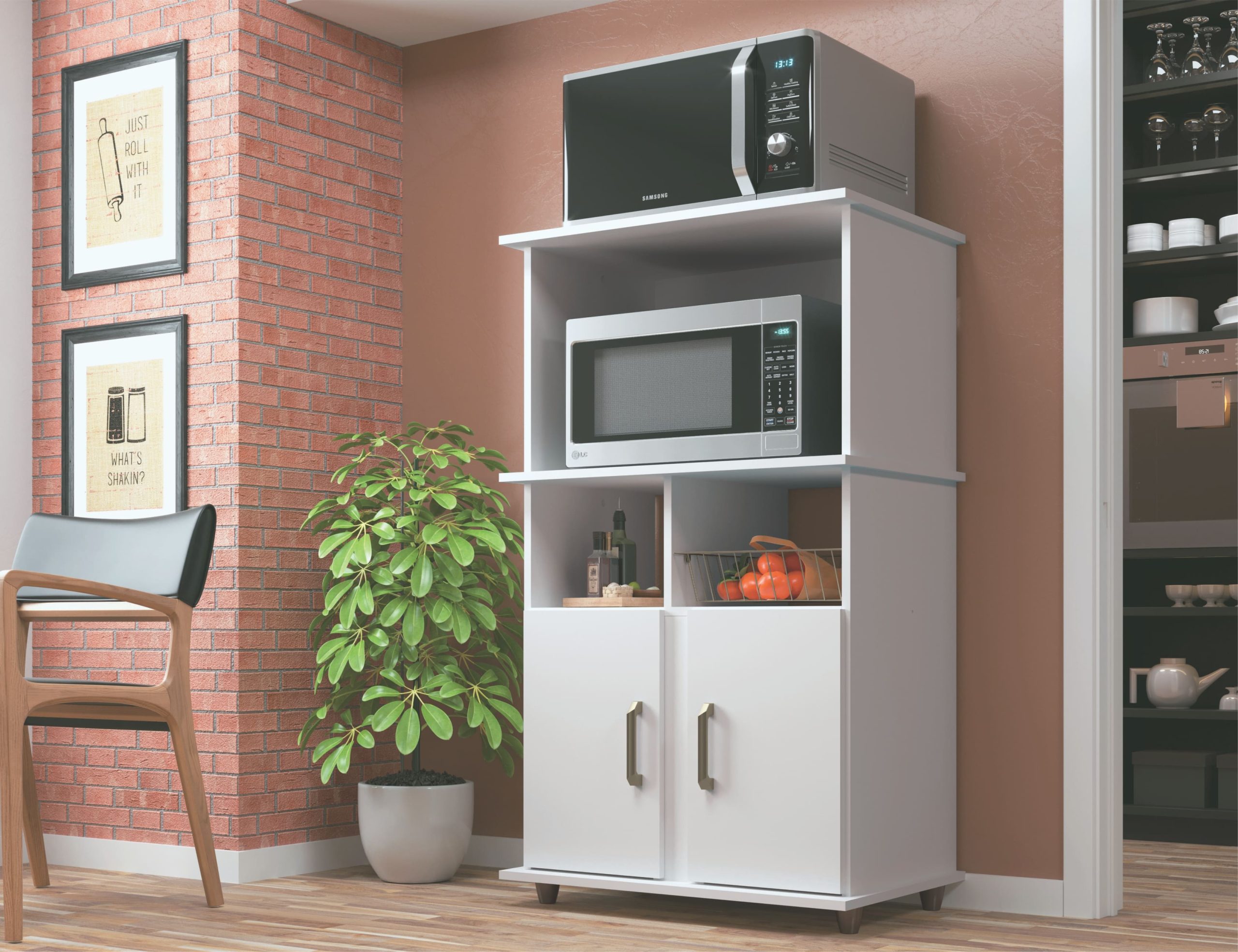 Multiuso R1 es ideal para horno o microondas, fabricado en 100% MDP con patas de plástico y cesta metálica. Con 2 puertas y 2 nichos para almacenamiento adicional, es perfecto para organizar tu cocina de manera eficiente.