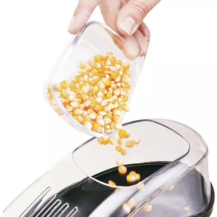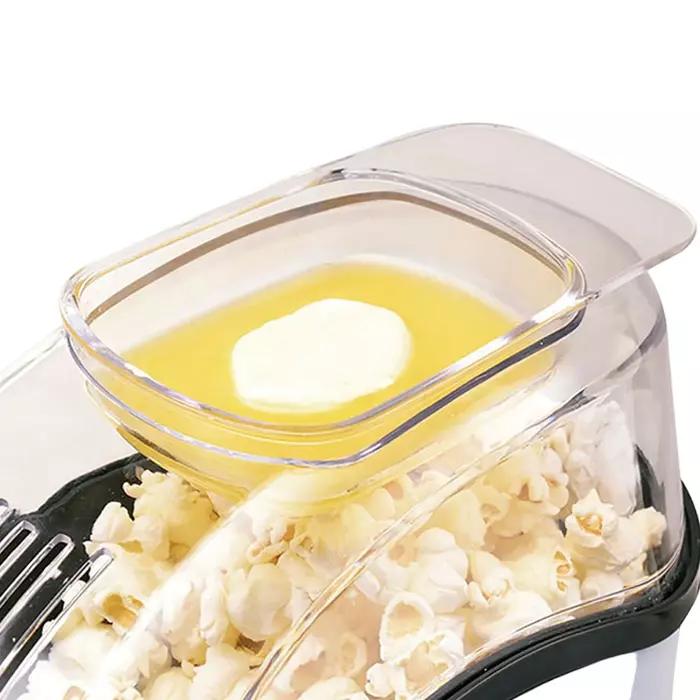Te ayuda a medir la cantidad exacta para la preparación. Además, puedes usarlo como reservorio para derretir mantequilla o coberturas especiales, utilizando el calor del aparato mientras las palomitas estallan.