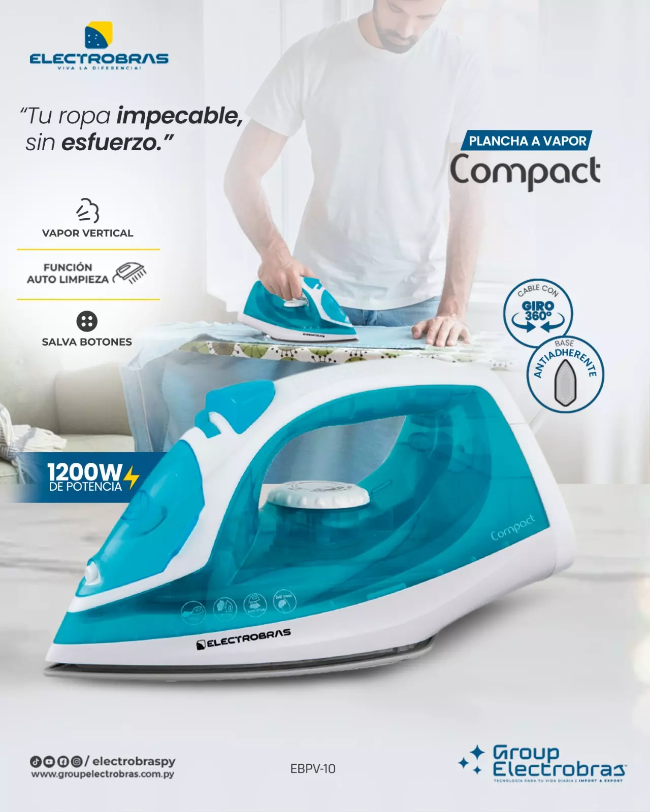 Disfruta de un planchado rápido y eficiente con la Plancha a Vapor Electrobras Compact. ¡Ideal para mantener tu ropa impecable de manera práctica y sencilla!