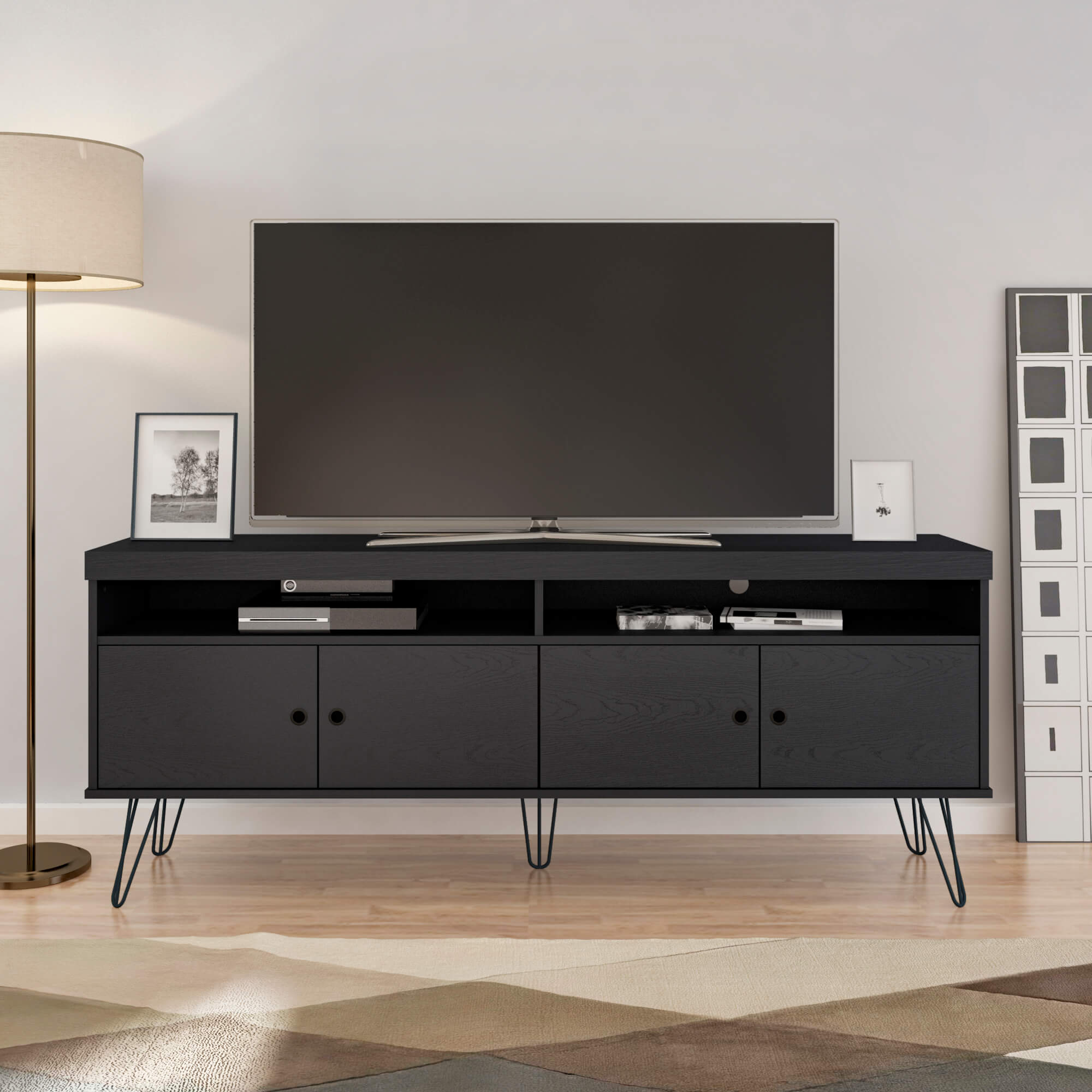 El Rack R8 es ideal para TVs de hasta 65”. Con un diseño retro funcional, 4 puertas y 2 amplios nichos para objetos, ofrece un almacenamiento práctico y estilizado. Los pies metálicos y la tapa de tamburato completan su diseño moderno y funcional.