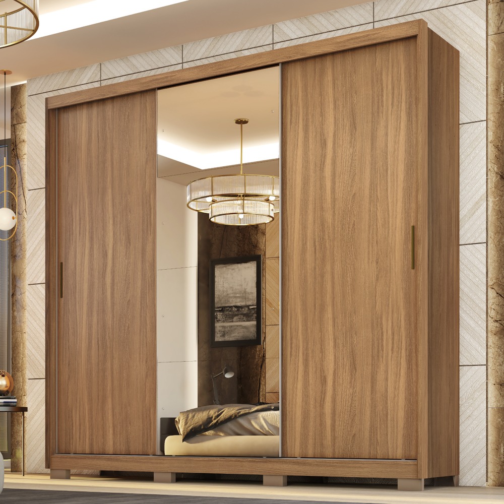 Su diseño en acabado Amêndoa y Off White baña tu cuarto de luz, calidez y sofisticación, mientras que su majestuosa puerta central con espejo y marco metálico te permite verte de cuerpo entero y amplía visualmente todo tu dormitorio.