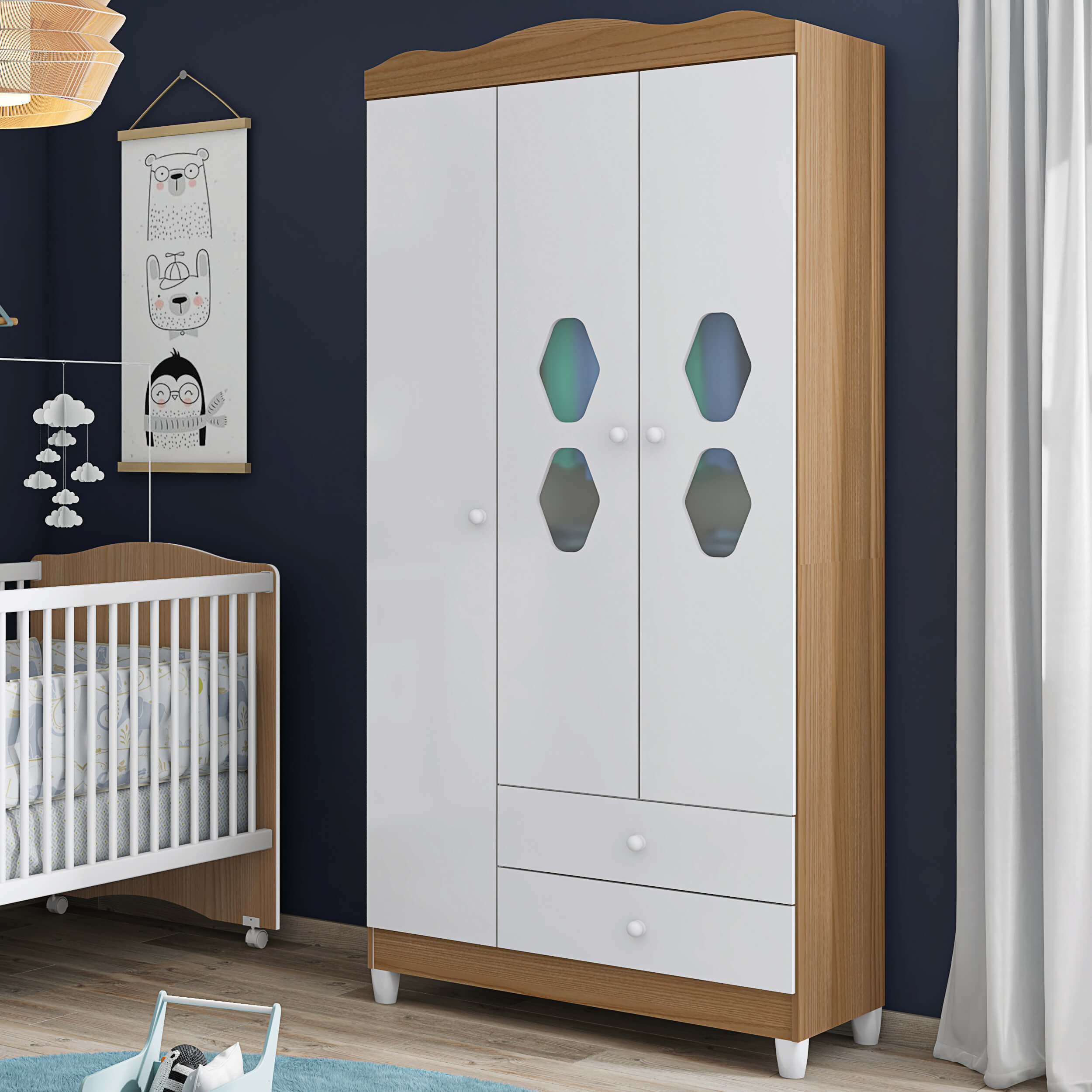 Ropero práctico y funcional con 3 puertas, 2 cajones y estantes ideales para dormitorios infantiles o juveniles.