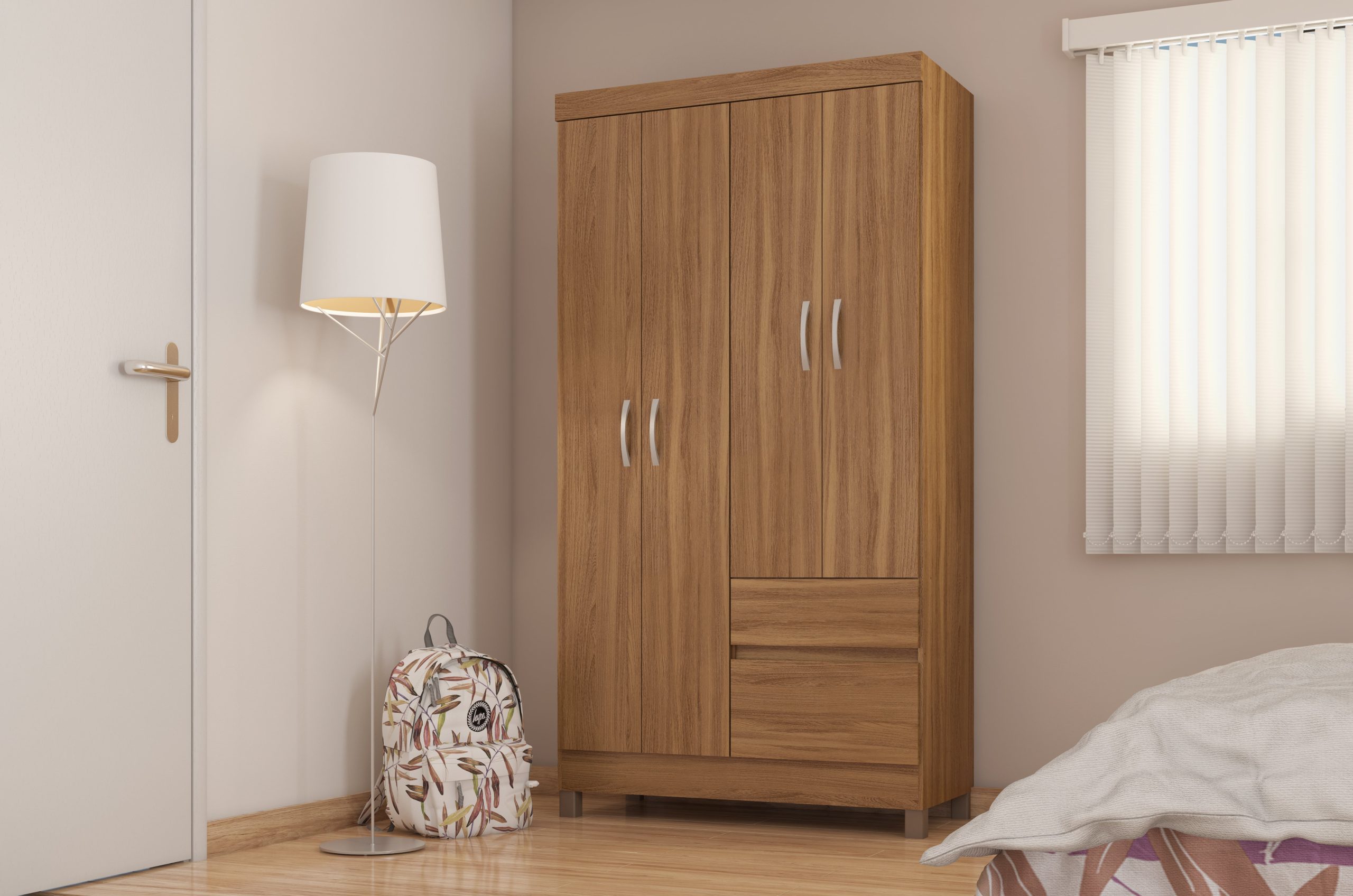 Ropero de 4 puertas con 2 cajones, 5 divisiones internas y percheros metálicos. Compacto, práctico y perfecto para organizar tu ropa.