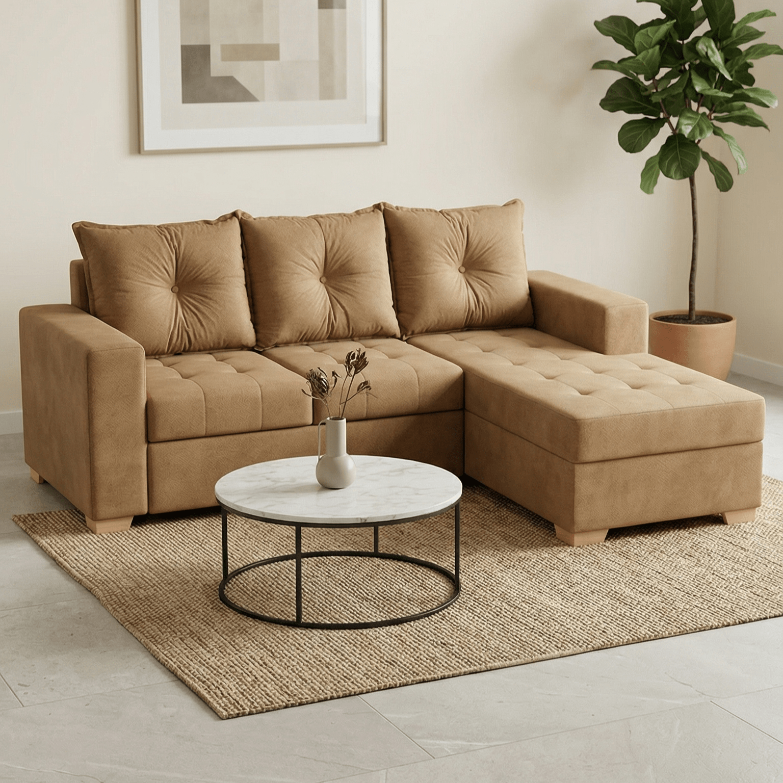 Con una longitud total de 210 cm, este sofá tiene el tamaño perfecto para adaptarse a la mayoría de las salas sin saturar el espacio. Su diseño en forma de «L» aprovecha de manera excelente la distribución de tu ambiente, permitiéndote ubicarlo tanto en esquinas como en el centro de la habitación.